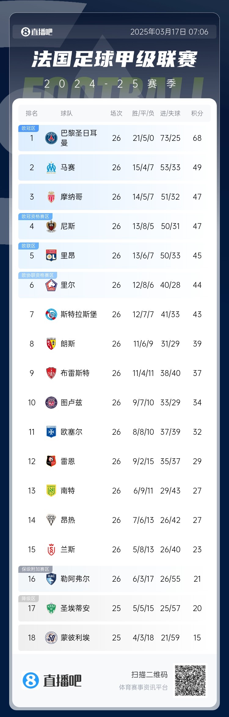 在法甲26輪過(guò)后巴黎領(lǐng)先次席馬賽的優(yōu)勢(shì)已經(jīng)達(dá)到19分,在聯(lián)賽還剩8輪的情況下,如果下一輪比賽巴黎獲勝,而馬賽輸球,摩納哥與尼斯戰(zhàn)平的話,巴黎即可提前奪得冠軍。