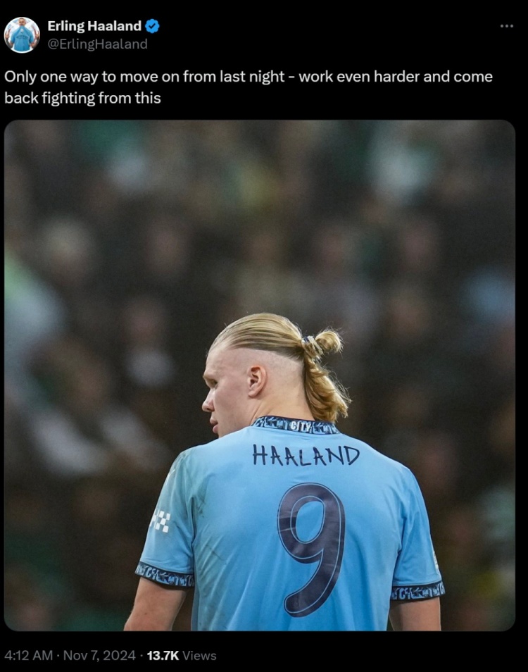 哈蘭德寫道:只有一種方法能走出昨天的比賽,那就是從陰霾中振作起來并更加努力。
