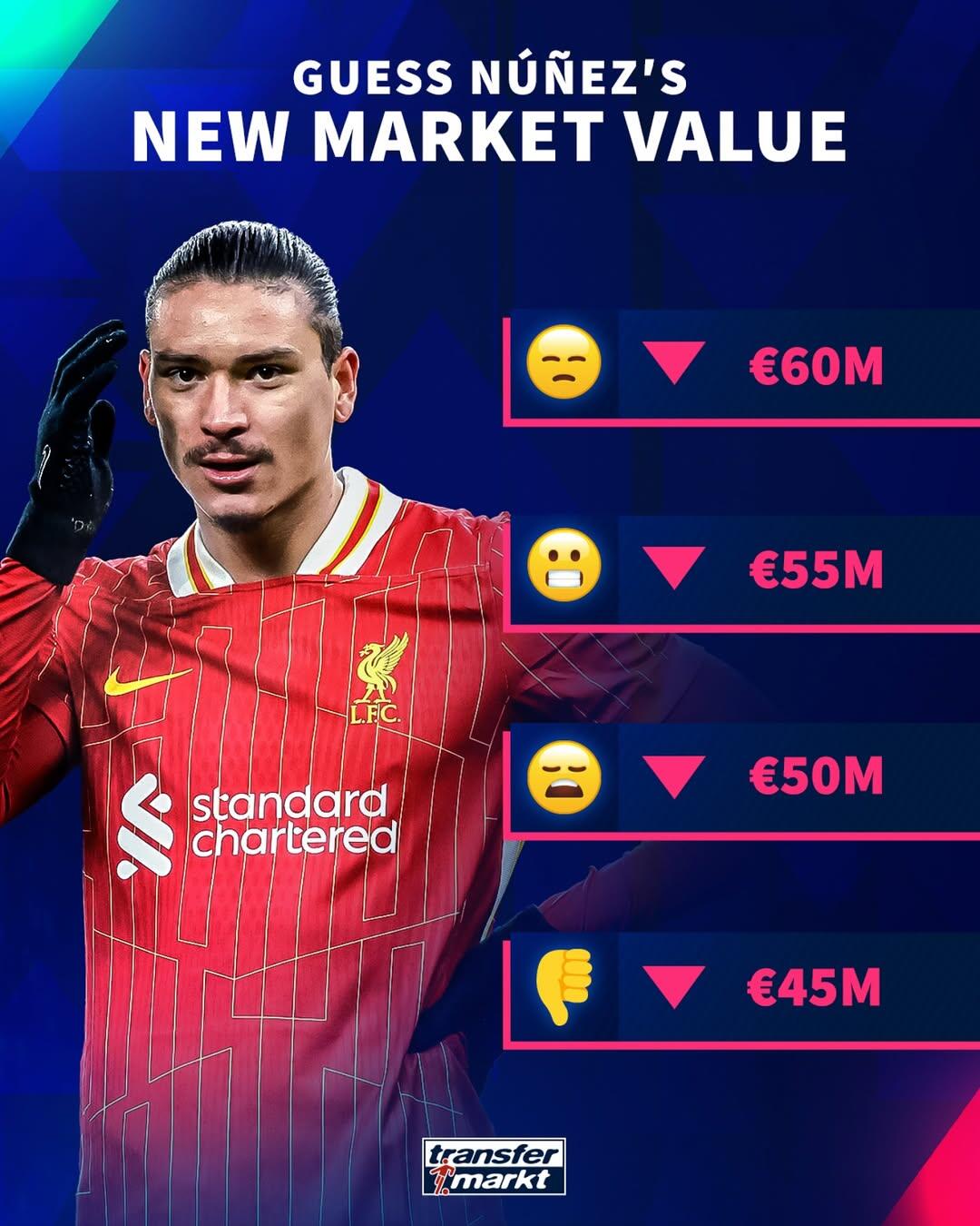 努涅斯目前身價為6500萬歐,德轉列出的努涅斯新身價的四個選項均為下跌,分別是6000萬歐、5500萬歐、5000萬歐和4500萬歐,最多可能暴跌2000萬歐。