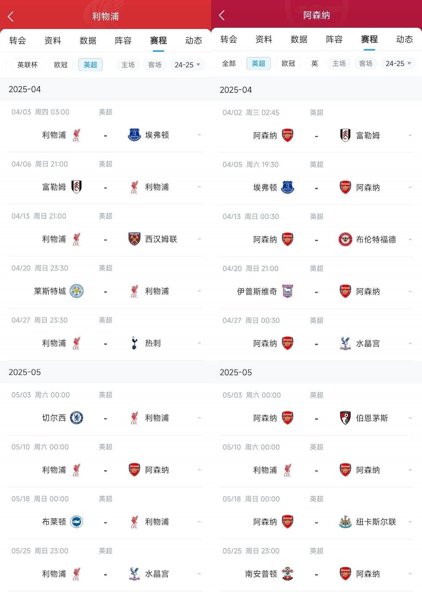 兩隊(duì)最后9輪的賽程對(duì)比如下,利物浦的對(duì)手稍微難一些,球隊(duì)將在35-37輪分別對(duì)陣切爾西、阿森納和布萊頓。此外第34輪對(duì)陣熱刺也不容忽視。阿森納所棘手的對(duì)手則主要是第36和37輪的利物浦和紐卡。