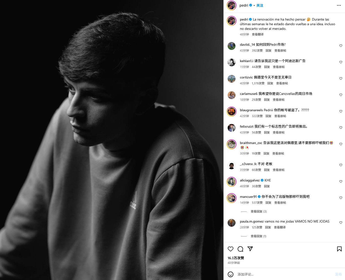 佩德里的配圖為他身穿阿迪達(dá)斯外套的照片,不少球迷認(rèn)為這應(yīng)該是贊助商廣告的預(yù)熱帖。
