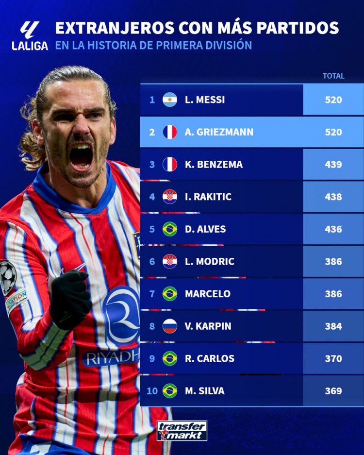 據(jù)德國轉(zhuǎn)會(huì)市場統(tǒng)計(jì),此役過后,格列茲曼已出戰(zhàn)520場西甲比賽,與梅西并列排名西甲歷史外援出場榜首位。