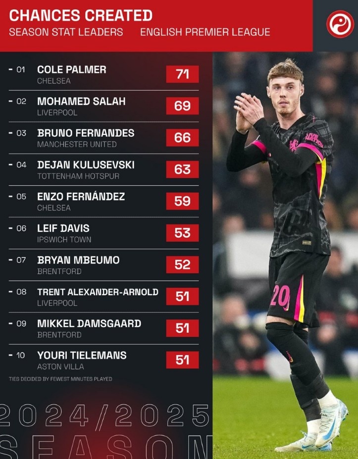 3月17日訊 數(shù)據(jù)網(wǎng)站Squawka盤點了本賽季英超創(chuàng)造機(jī)會榜,其中帕爾默以71次居首,不過他自去年12月對陣維拉之后還沒有送出過助攻。具體創(chuàng)造機(jī)會榜如下:
