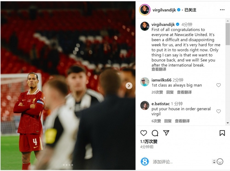 利物浦隊(duì)長(zhǎng)范迪克社媒曬出自己賽后失落的照片,并寫道:“首先祝賀紐卡的每個(gè)人。對(duì)我們來(lái)說(shuō),這是艱難而令人失望的一周,現(xiàn)在我很難用言語(yǔ)來(lái)表達(dá)感受。我唯一能說(shuō)的是,我們希望重新振作,我們會(huì)的!國(guó)際比賽日后再見(jiàn)?!?/p>