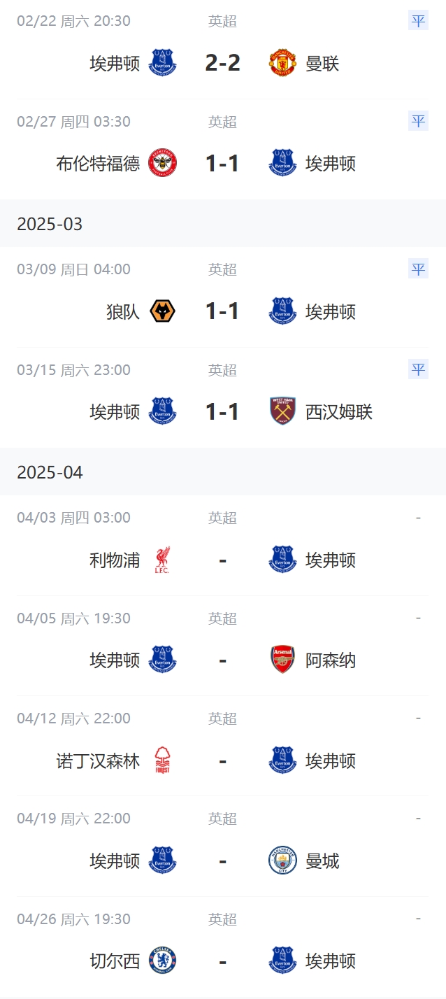 埃弗頓聯(lián)賽四連平,緊接著下個月就要連續(xù)交手英超前五名