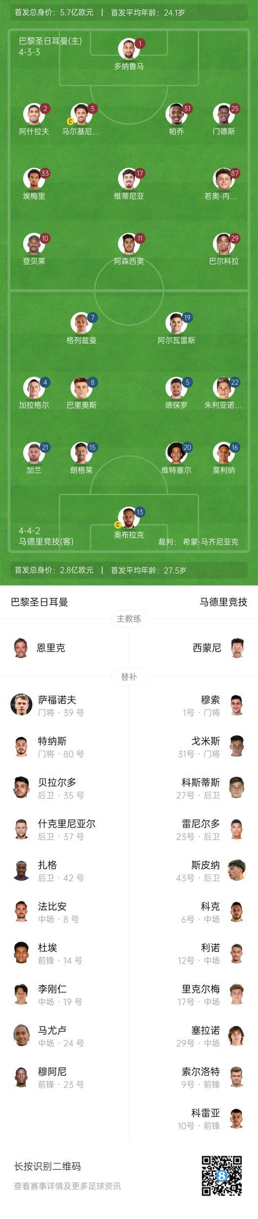 巴黎首發(fā):1-多納魯馬、2-阿什拉夫、5-馬爾基尼奧斯、25-努諾-門德斯、51-帕喬、17-維蒂尼亞、33-扎伊爾-埃梅里、87-若昂-內(nèi)維斯、10-登貝萊、11-阿森西奧、29-巴爾科拉