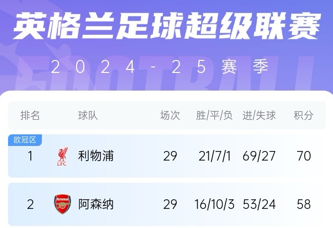 目前利物浦和阿森納均29輪賽罷,利物浦70分,領(lǐng)先阿森納12個(gè)積分,聯(lián)賽還剩下9輪。
