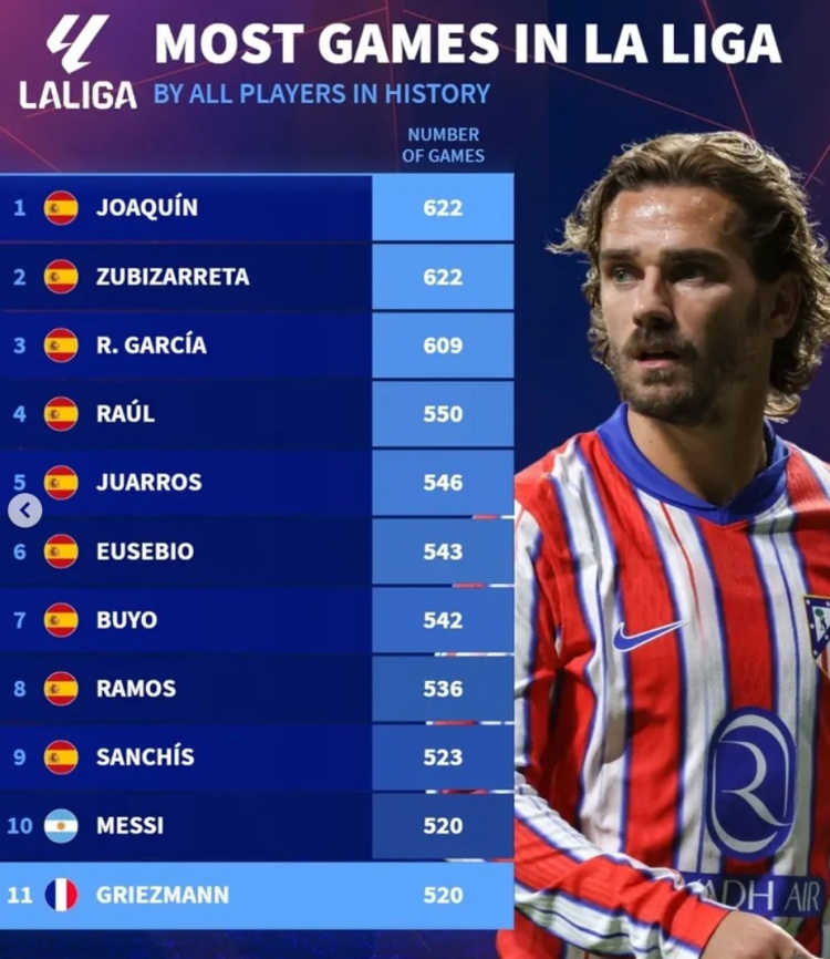 3月17日訊 馬競(jìng)在本輪西甲焦點(diǎn)戰(zhàn)2-4被巴薩逆轉(zhuǎn),格列茲曼達(dá)成“里程悲”。數(shù)據(jù)統(tǒng)計(jì)顯示,他在本場(chǎng)比賽達(dá)成西甲生涯520場(chǎng)出場(chǎng),追平梅西,并列西甲歷史出場(chǎng)榜前十。