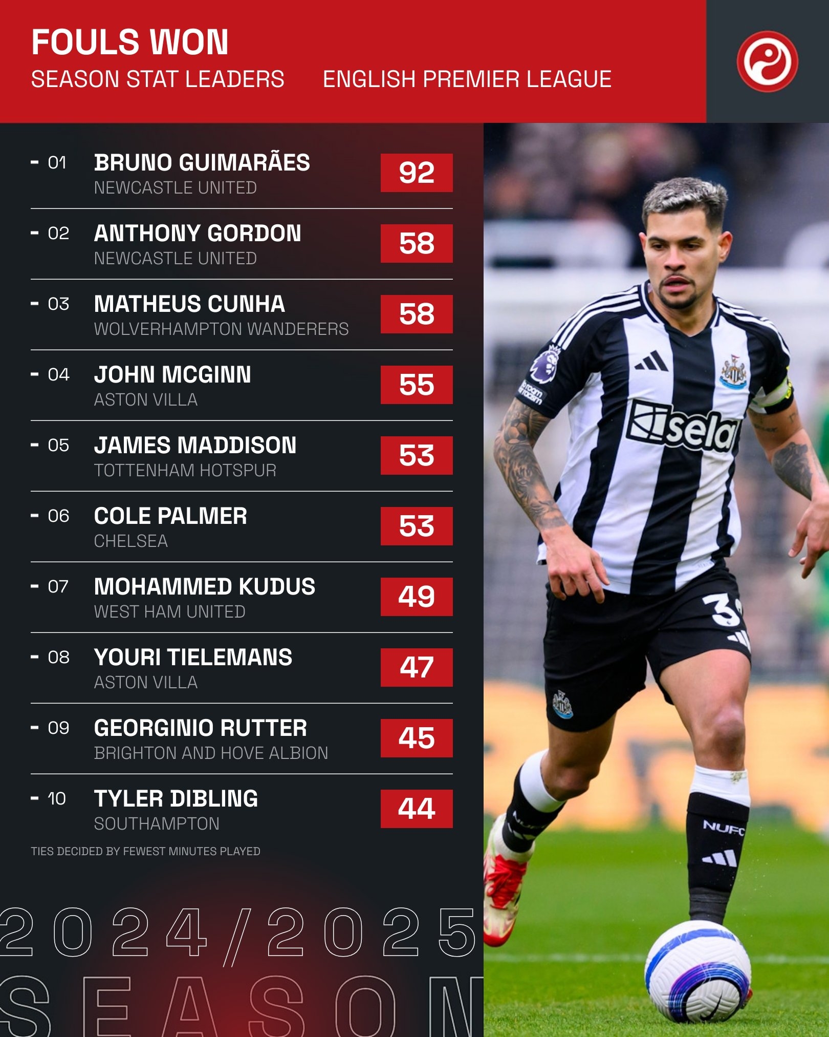 03月18日訊 squakwa統(tǒng)計(jì)了本賽季英超球員被犯規(guī)次數(shù)榜,吉馬良斯高居榜首,麥迪遜、帕爾默在列。