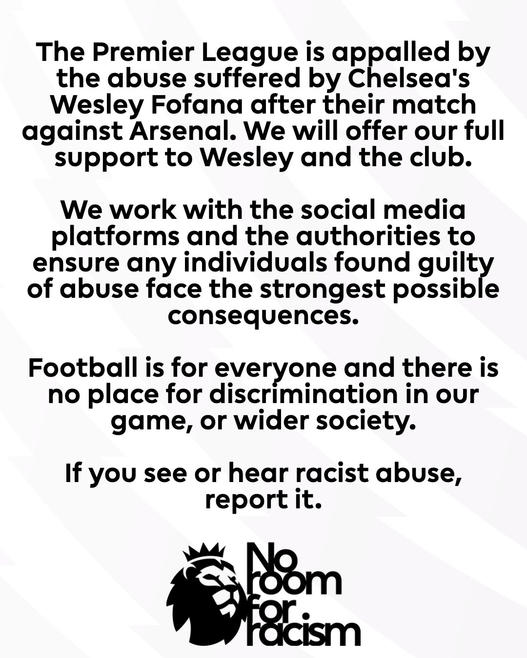 英超官方寫(xiě)道:在切爾西對(duì)陣阿森納的比賽后,福法納遭到了辱罵,英超聯(lián)賽對(duì)此深感震驚。我們將全力支持福法納及切爾西俱樂(lè)部。