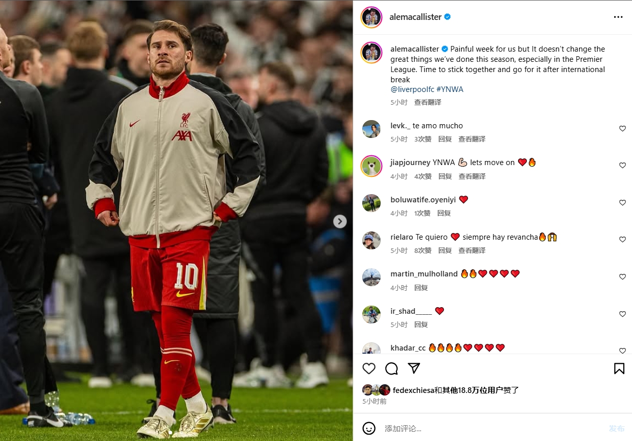 麥卡利斯特在社交媒體上寫道:“對我們來說,這是痛苦的一周,但這不會改變我們本賽季的出色表現(xiàn),特別是在英超聯(lián)賽中。是時候團結一致,在國際比賽日之后全力以赴了?!?/p>