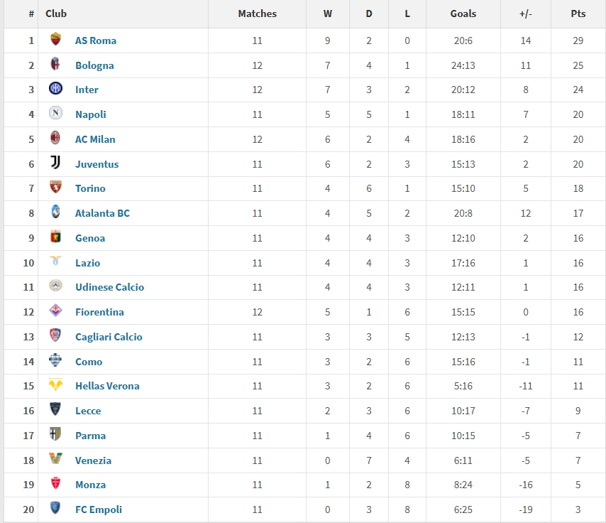 排在次席的是博洛尼亞(25分),第三是國(guó)米(24分),而那不勒斯、米蘭以及尤文圖斯均拿到了20分,位列4-6名。
