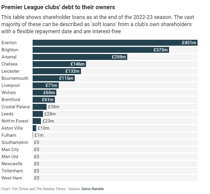 目前埃弗頓的股東貸款高達(dá)4.51億英鎊,高居英超第一,其次是布萊頓的3.73億英鎊和阿森納的2.59億英鎊。