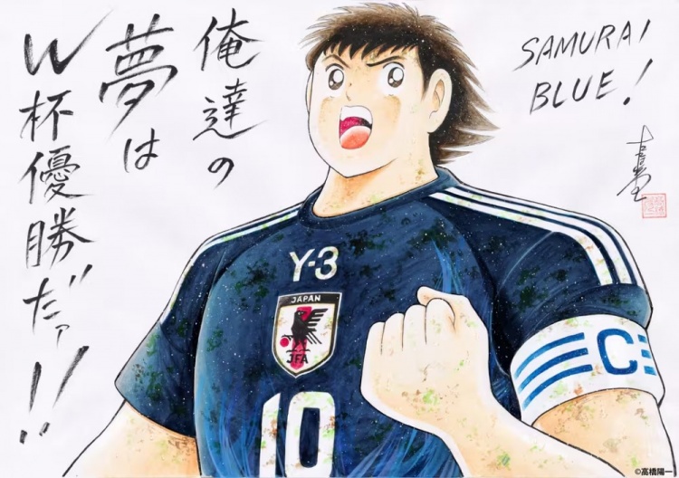 這是高橋陽一在3月世預(yù)賽期間特意為日本隊設(shè)計的應(yīng)援插畫,插畫上是大空翼穿著日本國家隊球衣用力握拳的模樣,并寫著:“我們的夢想是世界杯冠軍??!”