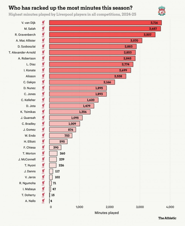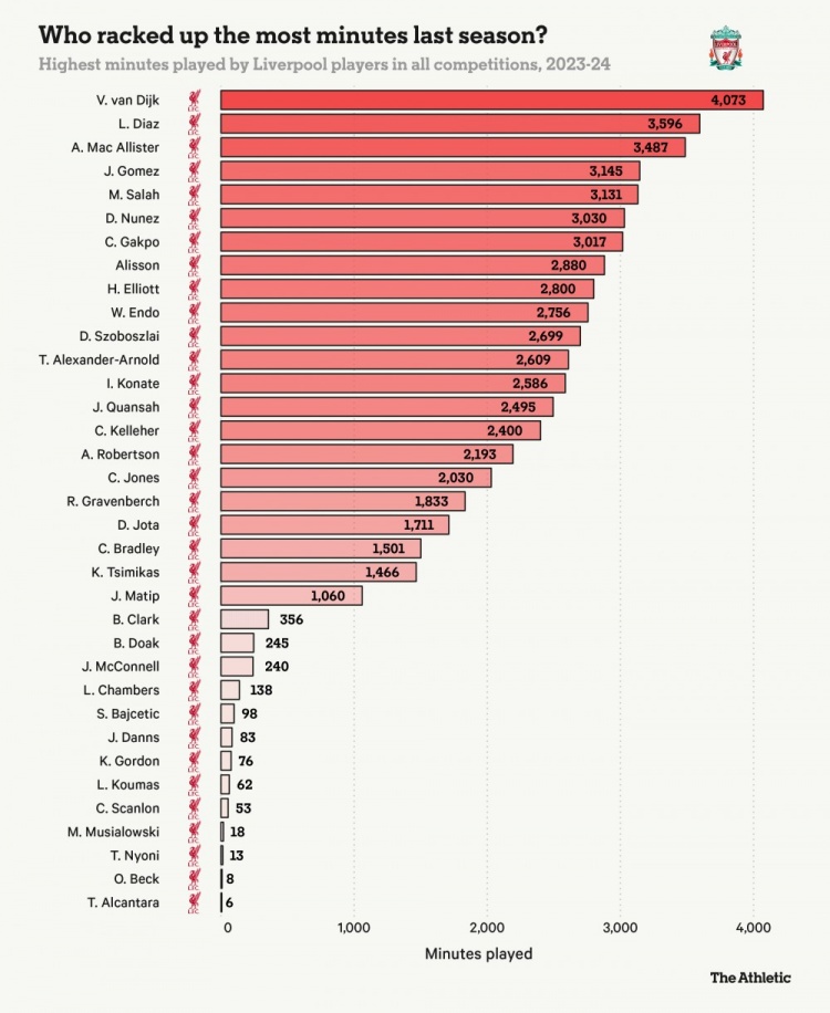 從時(shí)間分布看差異更明顯:2023-24賽季有10人出場時(shí)間在2000-3000分鐘區(qū)間。而按照現(xiàn)有趨勢推算,本賽季利物浦最多僅有6人處于該區(qū)間(其中還包括了替補(bǔ)門將凱萊赫和左后衛(wèi)齊米卡斯)。