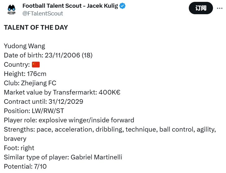 03月18日訊 專注于發(fā)掘年輕球員的知名球探網(wǎng)站Football Talent Scout今日發(fā)表了中國(guó)球員王鈺棟的球探報(bào)告,報(bào)告中評(píng)價(jià)王鈺棟的模板是阿森納前鋒馬丁內(nèi)利,并給王鈺棟打出了7分的潛力評(píng)分。