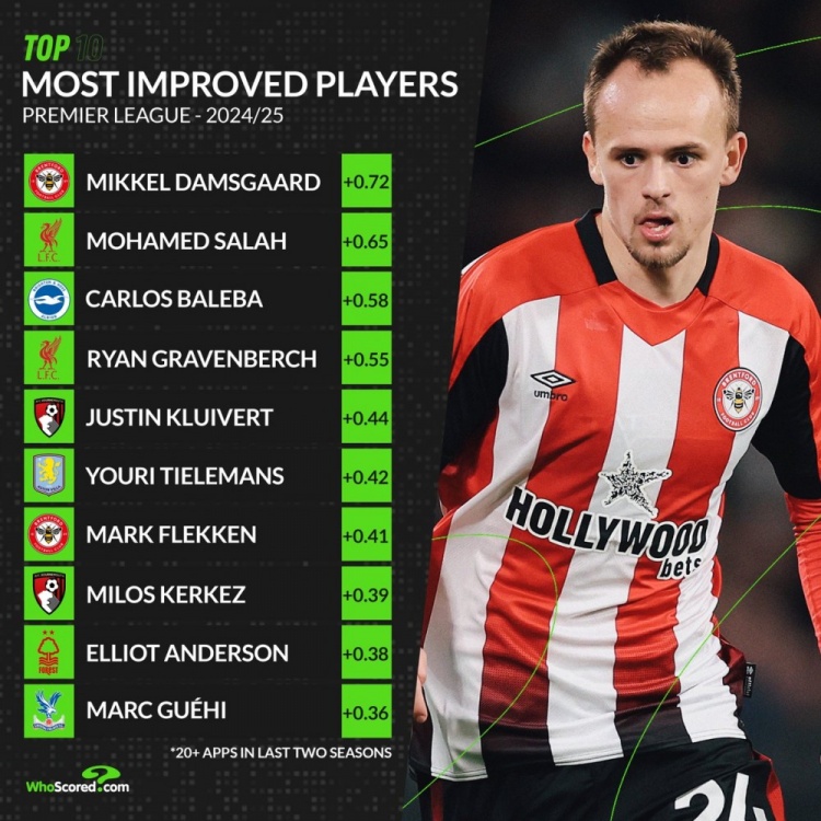 whoscored英超球員相比上賽季評分提升榜:近2個(gè)賽季至少都出場20次