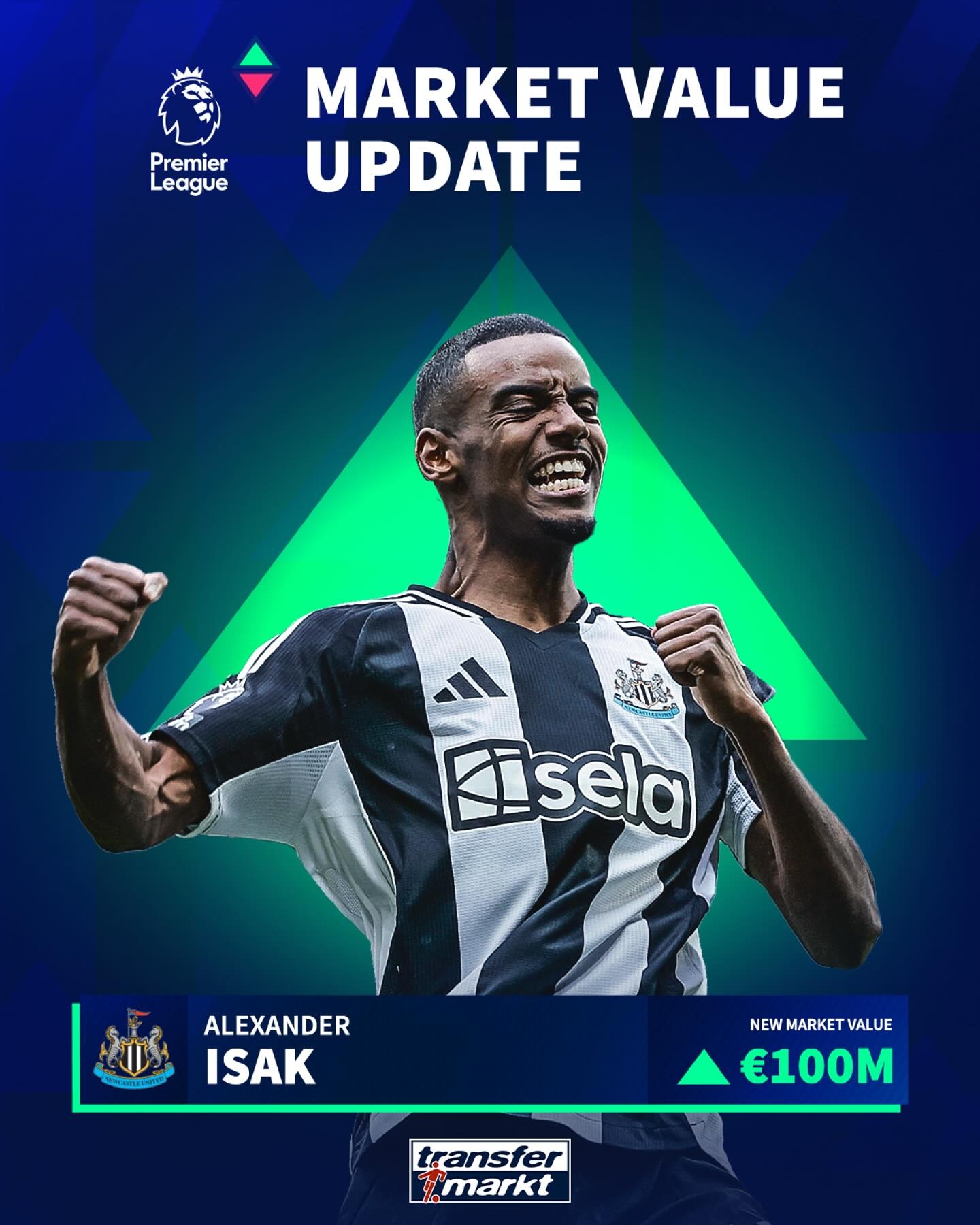 03月18日訊 德國(guó)足球轉(zhuǎn)會(huì)市場(chǎng)今日更新英超球員身價(jià),紐卡前鋒伊薩克身價(jià)暴漲2500萬(wàn)歐元,從7500萬(wàn)歐漲至1億歐,成為新晉億元先生。
