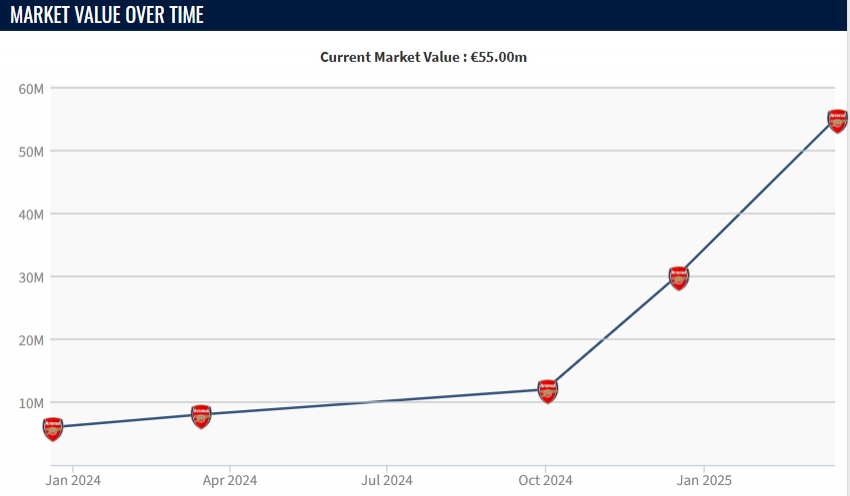 從2024年10月至今不到半年的時(shí)間,恩瓦內(nèi)里的身價(jià)已經(jīng)從1200萬暴漲到5500萬。據(jù)羅馬諾報(bào)道,阿森納已經(jīng)接近和恩瓦內(nèi)里敲定新的續(xù)約合同,恩瓦內(nèi)里將在3月21日迎來18歲生日,日前他跳級(jí)入選了英格蘭U21名單。