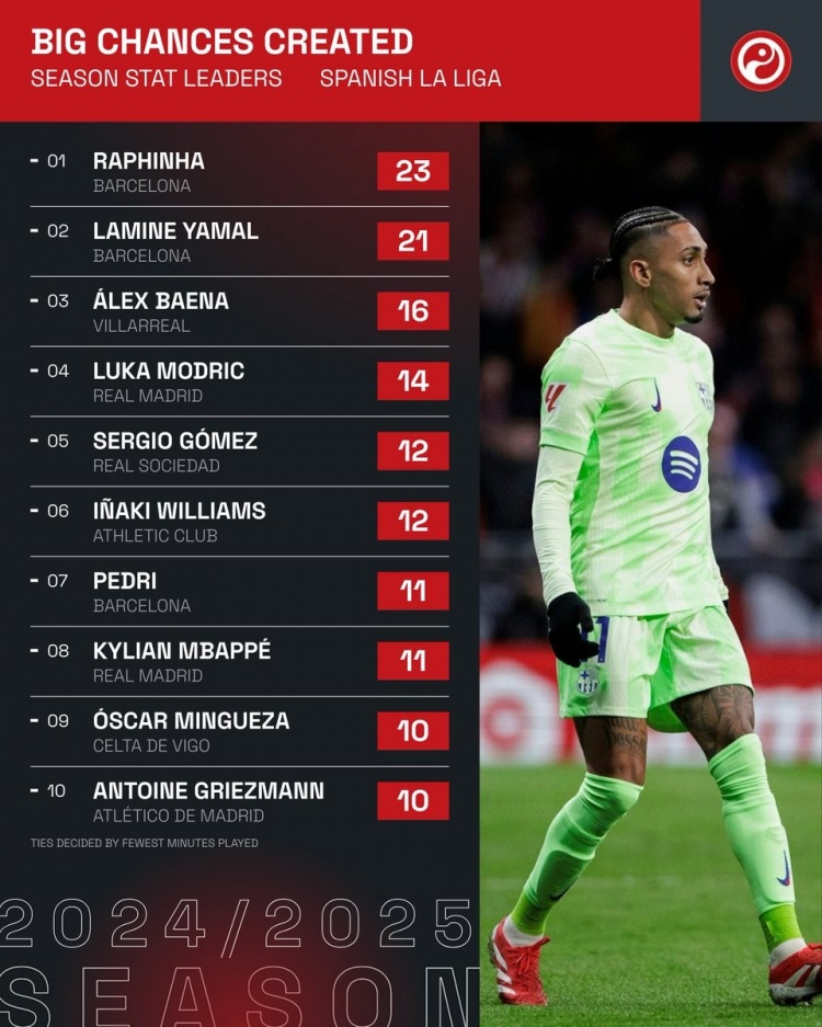 3月19日訊 國家隊比賽周到來,西甲也暫時告一段落,squakwa統(tǒng)計了本賽季西甲創(chuàng)造重大機會情況,巴薩雙邊鋒分列前二。