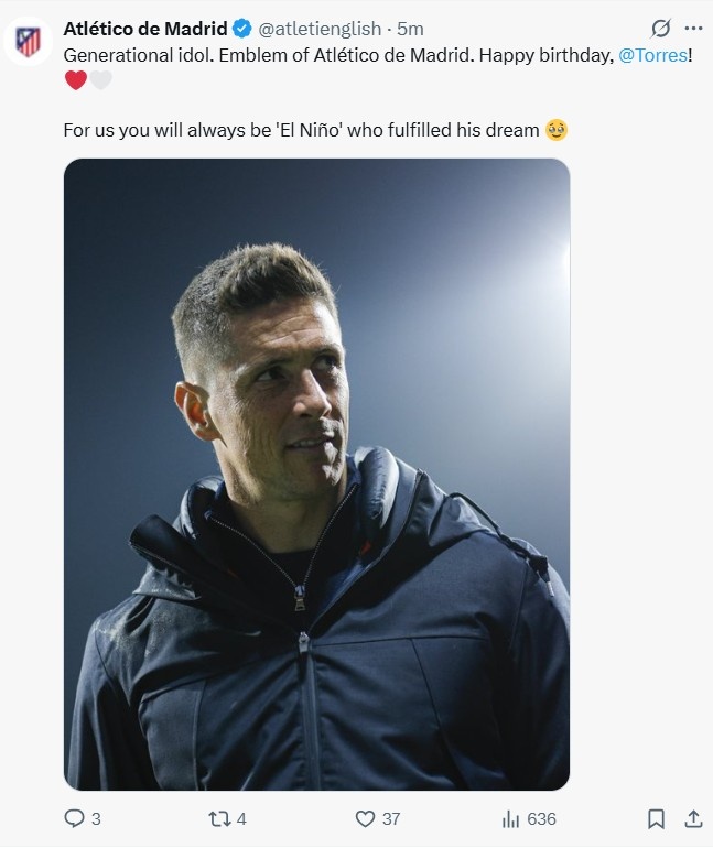 馬競官方表示道:“一代偶像,馬競的象征,生日快樂托雷斯!??