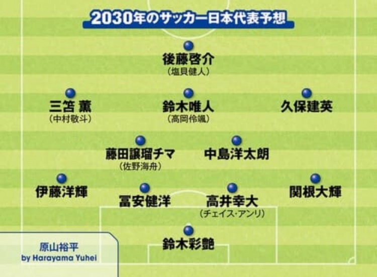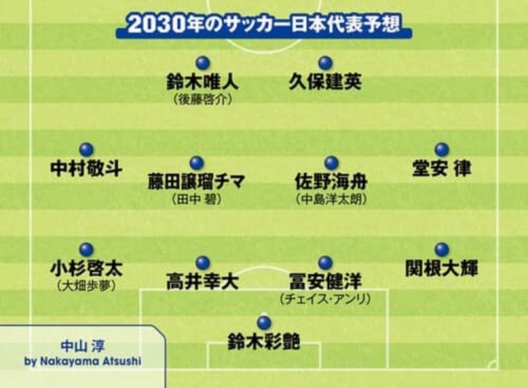 3月30日訊 據(jù)日媒Sportiva報道,近日該媒體開設(shè)專欄,開始對2030年世界杯日本隊首發(fā)陣容預(yù)測,有部分日本國內(nèi)的自由撰稿人投稿對首發(fā)進行預(yù)測。以上撰稿人預(yù)測的陣容中,基本都是本期日本國家隊陣中的年輕球員,并結(jié)合部分現(xiàn)役U22國家隊、U20國家隊球員等組合而成。