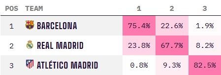 本輪西甲,馬競客場1-1戰(zhàn)平西班牙人,賽后多賽距離榜首已有6分之差。數(shù)據(jù)機構(gòu)Opta給出的最新數(shù)據(jù)顯示,馬競本賽季西甲奪冠概率只剩下0.8%,基本可以宣布退出爭冠。