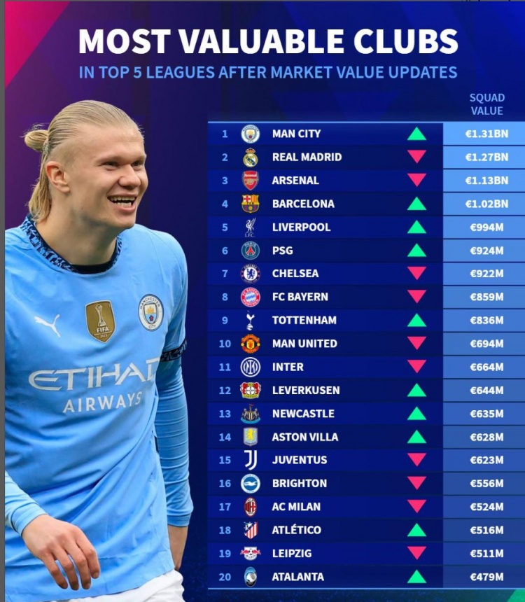轉(zhuǎn)會(huì)市場(chǎng)列五大聯(lián)賽俱樂部最新身價(jià)榜:歐元