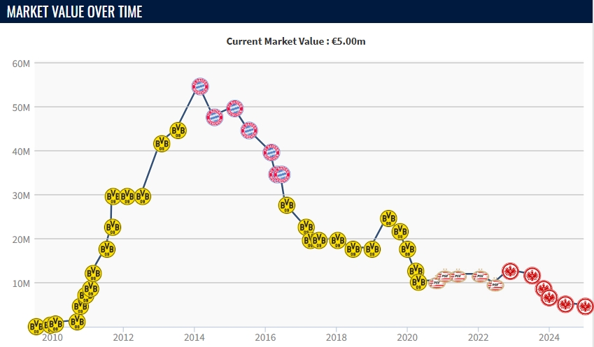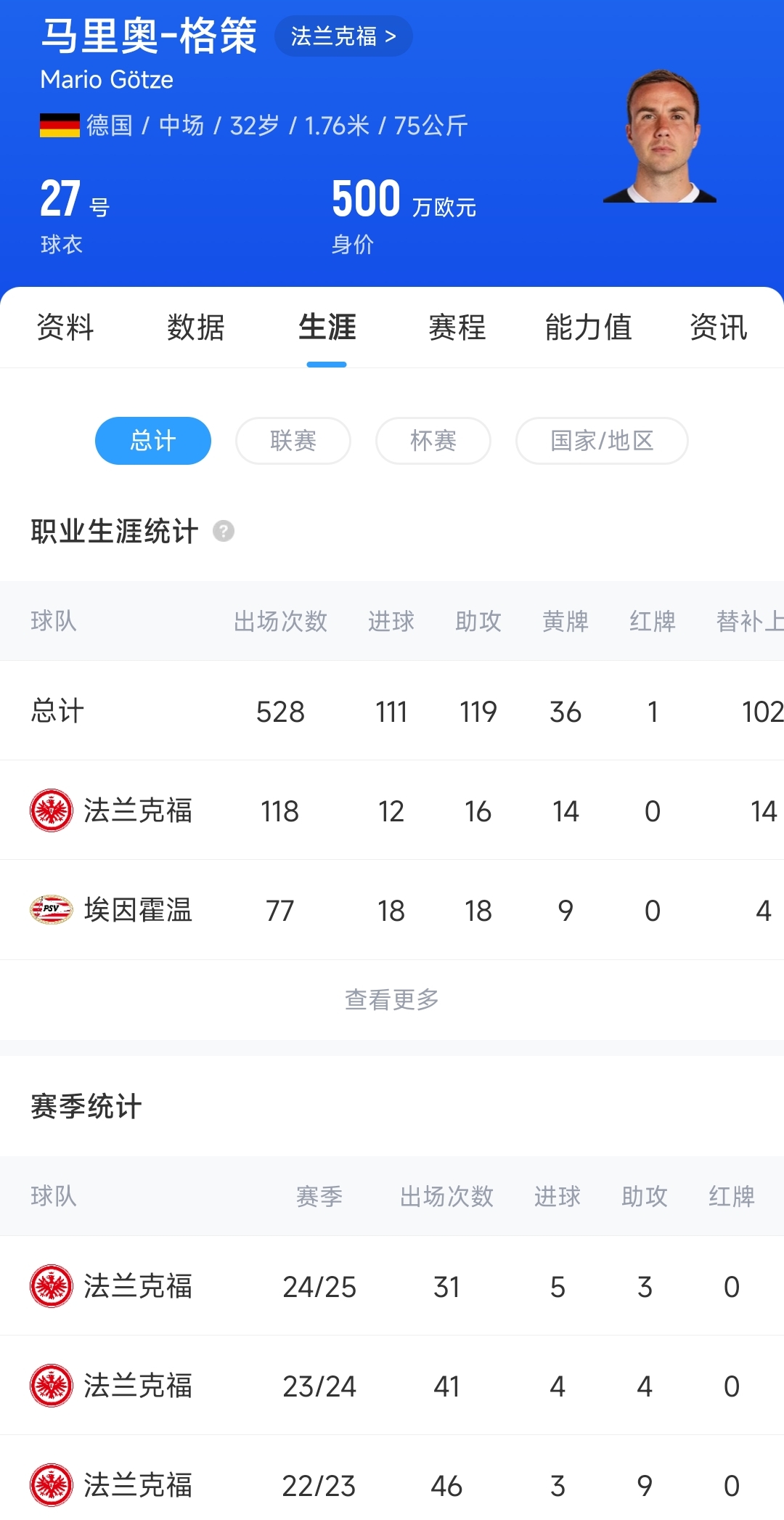 2014年效力拜仁時,21歲的格策身價曾達到最高值5500萬歐元。10年過去后,目前格策的德轉(zhuǎn)身價為500萬歐元,他與法蘭克福的合同將在2026年6月30日到期。