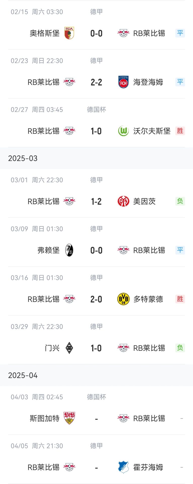 RB萊比錫近期戰(zhàn)績↓