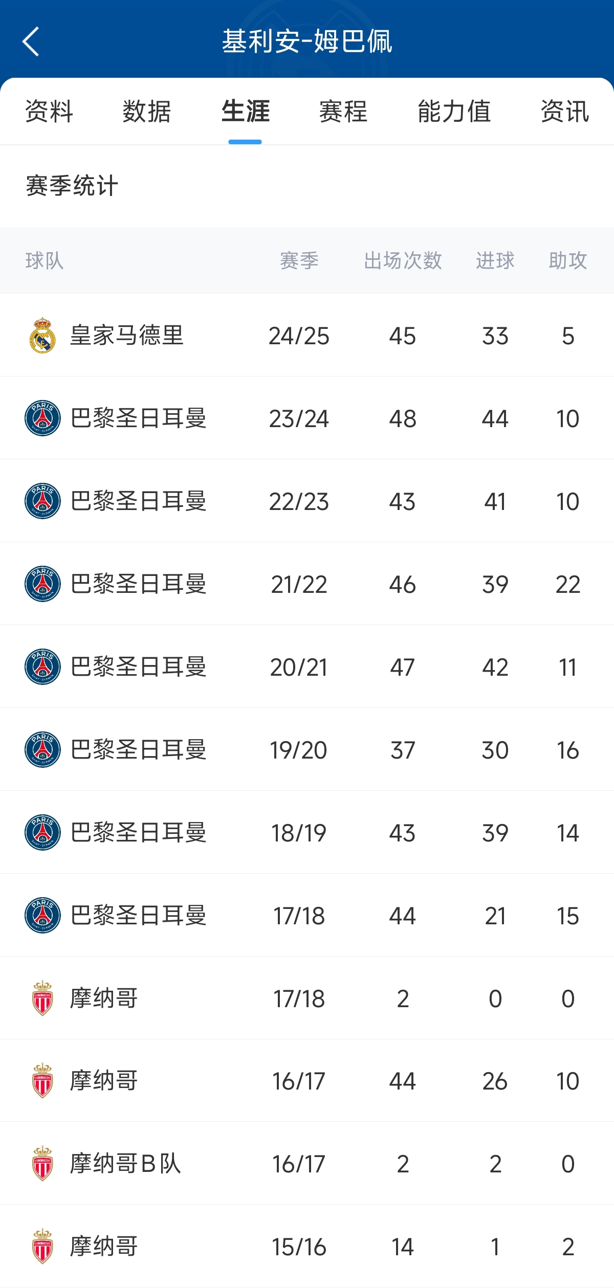 姆巴佩在皇馬的首秀賽季進(jìn)球數(shù)已達(dá)到33球,追平C羅的皇馬首秀賽季?;仡櫮钒团迓殬I(yè)生涯出道至今,他的表現(xiàn)一直都很不錯,除了生涯首秀賽季15/16賽季。那年年僅17歲的姆巴佩在一線隊只有1個進(jìn)球。但是從隨后的賽季開始,姆巴佩進(jìn)球數(shù)從來沒有低于20,且僅有前三個賽季低于30。