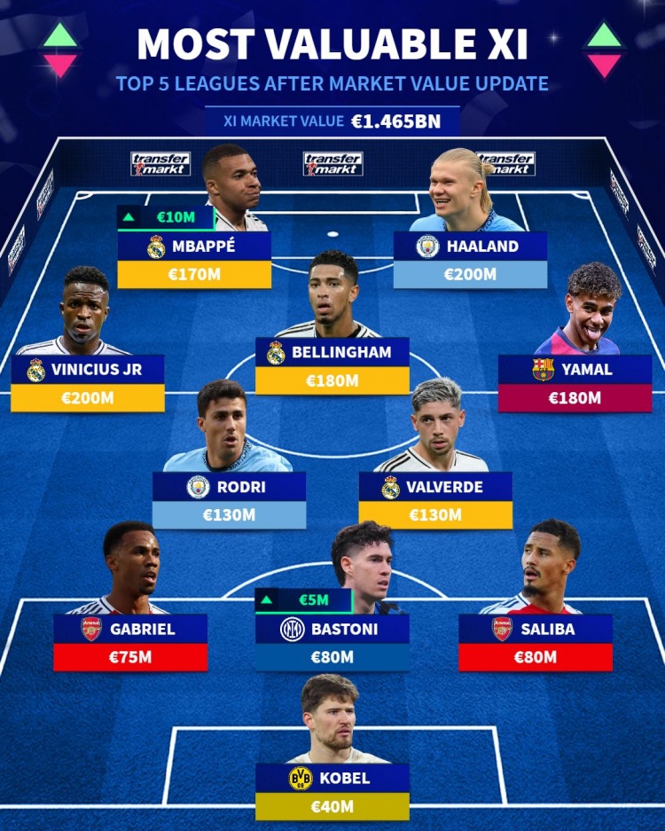 3月31日訊 德國轉(zhuǎn)會市場更新了五大聯(lián)賽球員的身價,并列出身價最高陣容,哈蘭德、姆巴佩、維尼修斯、貝林厄姆、亞馬爾在列。