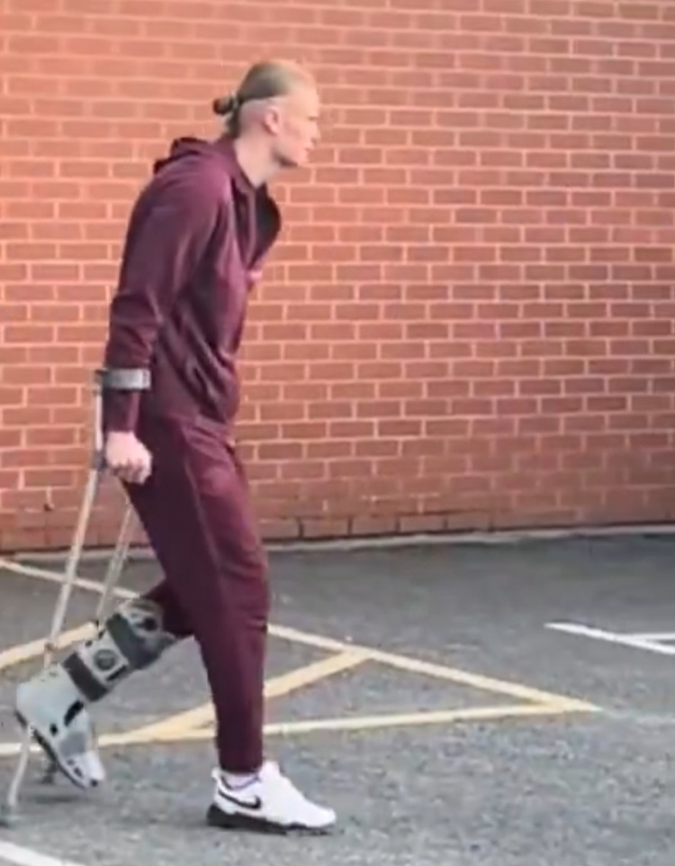 據(jù)賽后球迷拍到的畫面,哈蘭德拄拐離開球場,并且腳上穿著保護靴。