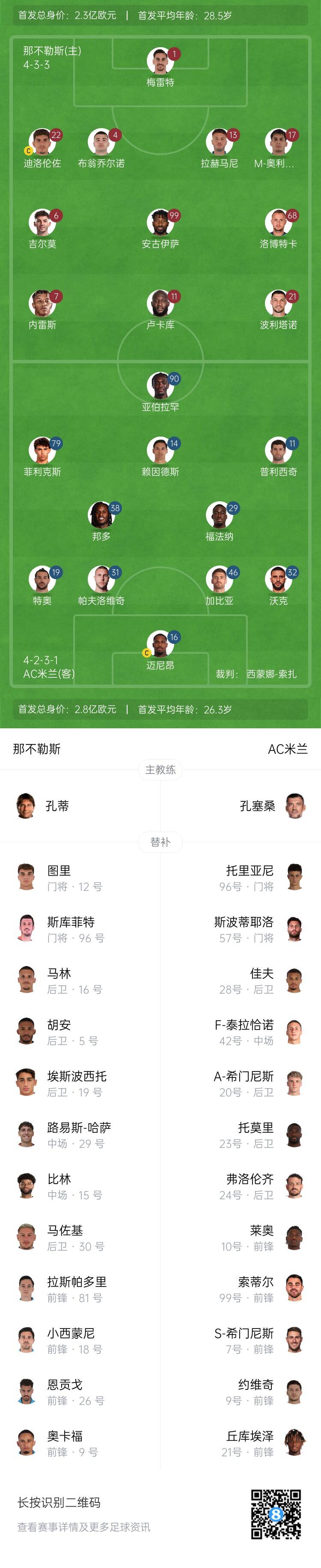 那不勒斯替補(bǔ):12-圖里、96-斯庫(kù)菲特、5-胡安、9-奧卡福、15-比林、18-小西蒙尼、19-埃斯波西托、26-恩貢戈、29-哈薩、30-馬佐基、81-拉斯帕多里