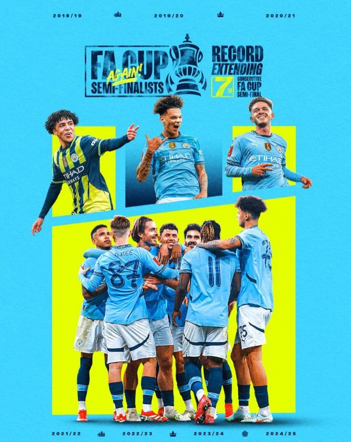 這也是曼城連續(xù)7個賽季打進足總杯半決賽,這也是賽事歷史首次有球隊能做到這一點。