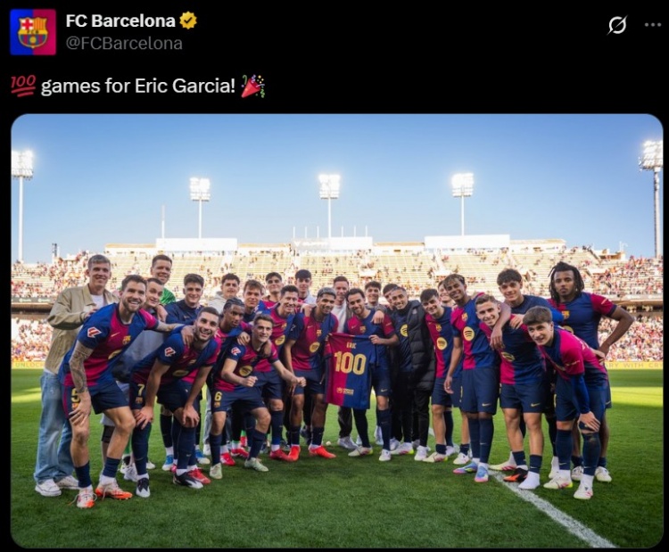 本場比賽埃里克-加西亞首發(fā)登場,這是他加盟巴薩以來各項賽事第100次出場,賽后他也獲贈球隊100號定制球衣,并與全隊球員合影留念。