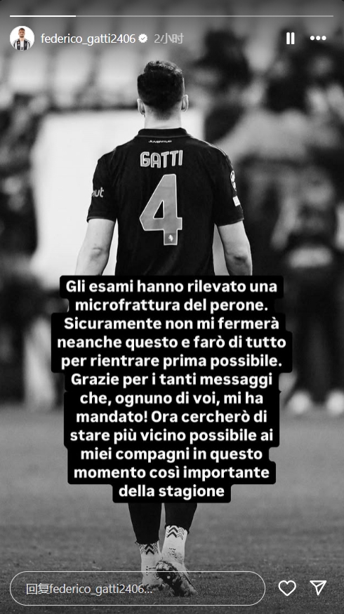 這名中衛(wèi)更新社媒,說(shuō)道:經(jīng)檢查發(fā)現(xiàn)腓骨出現(xiàn)輕微骨折,這當(dāng)然不會(huì)阻擋我,我會(huì)盡一切努力盡快回來(lái),謝謝你們給我發(fā)來(lái)的信息,在本賽季現(xiàn)階段這樣非常重要的時(shí)刻,我會(huì)盡可能與我的隊(duì)友們保持密切聯(lián)系。