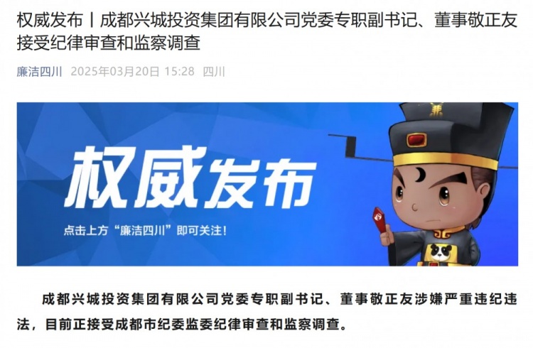 3月20日訊 根據(jù)“廉潔四川”公眾號(hào)消息,成都興城投資集團(tuán)有限公司黨委專職副書記、董事敬正友接受紀(jì)律審查和監(jiān)察調(diào)查。