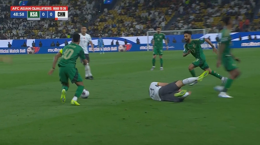 小動作,沙特球員與張玉寧對抗后,踩了一腳倒地的張玉寧
