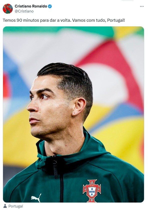 C羅曬出了自己的照片,并配文寫道:“我們有90分鐘的時間扭轉局面,讓我們全力以赴,葡萄牙!”